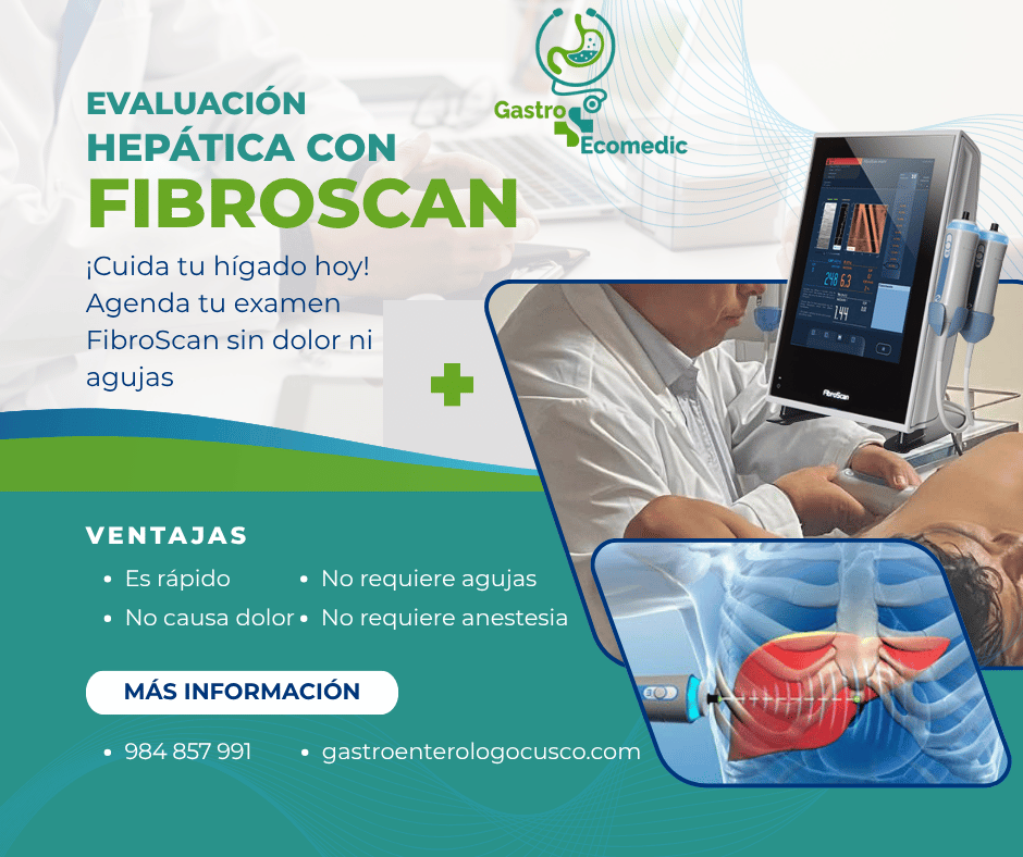 El FibroScan hepático es una herramienta de diagnóstico moderna, segura y no invasiva que permite evaluar la salud del hígado en pocos minutos. En GastroEcomedic Cusco, el Dr. Oswaldo Zapata Carreño, especialista en Gastroenterología, utiliza esta tecnología de última generación para detectar fibrosis y grasa hepática sin necesidad de biopsia.