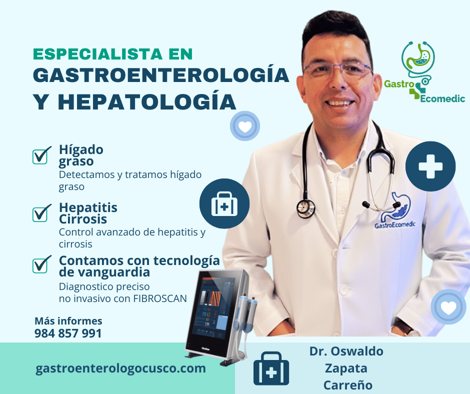 El Dr. Oswaldo Zapata Carreño, especialista en gastroenterología y hepatología, ofrece en Cusco una evaluación moderna y no invasiva con Fibroscan, la tecnología más confiable para conocer el estado real de tu hígado en solo minutos.